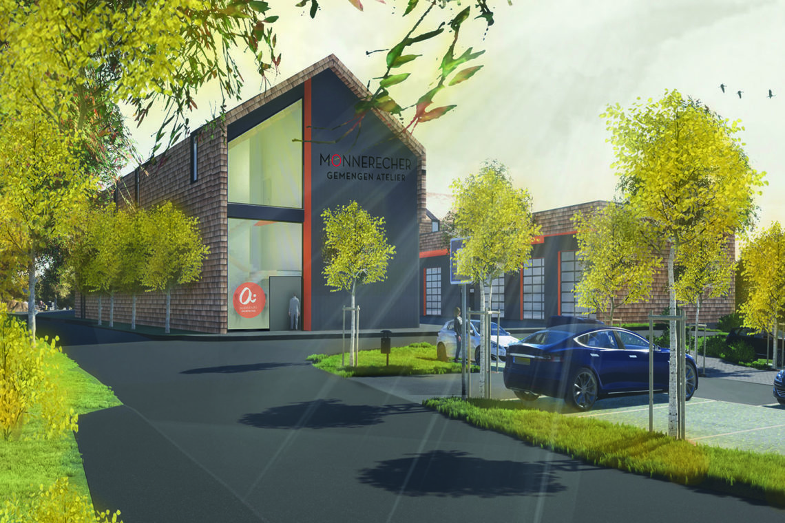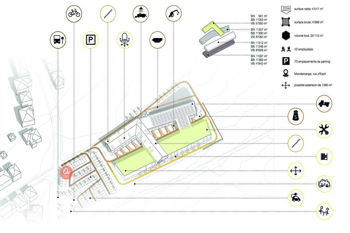 Les nouveaux ateliers pour la commune de Mondercange sont conçus pour 42 ouvriers. Le projet se caractérise par son site urbanistique, les exigences fonctionnelles et les conditions générales économiques et écologiques (Pacte climat). Par le biais du nouveau croisement, on arrive jusqu’au parking comptant 80 emplacements, privés et visiteurs. A côté du parking se trouve une aire de jeux, laquelle est joignable par la rue ainsi que par la piste cyclable adjacente. Situé dans la rue principale, l’arrêt de bus avec des emplacements pour vélos s’intègre pour raccorder le site au transport public.