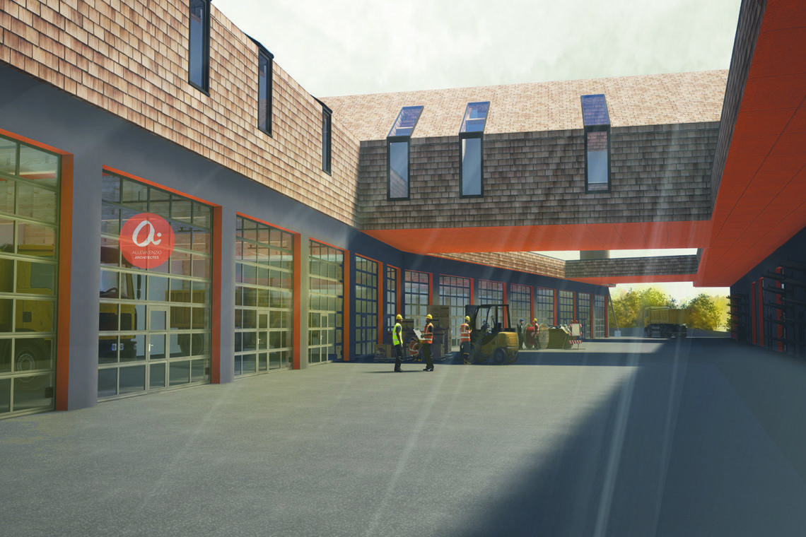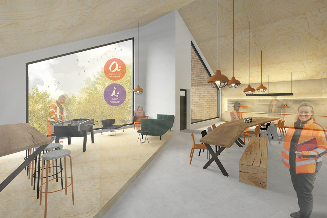 „Tout sous un toit“ décrit le concept de réduction de l’organisation communale sur un seul immeuble. Ainsi, les chemins internes sont raccourcis et les processus de travail optimisés en permettant une vue d‘ensemble. La cour intérieure comme axe d’exploitation claire et directe offre une organisation rationnelle et garantit la proximité entre les différentes entités. La situation d’entrée sépare l’espace public et la cour d’exploitation interne privée. L’immeuble reflète le lien avec la nature grâce à l’utilisation du matériau bois. Les murs extérieurs ainsi que le toit en pente sont revêtus de bardeaux.